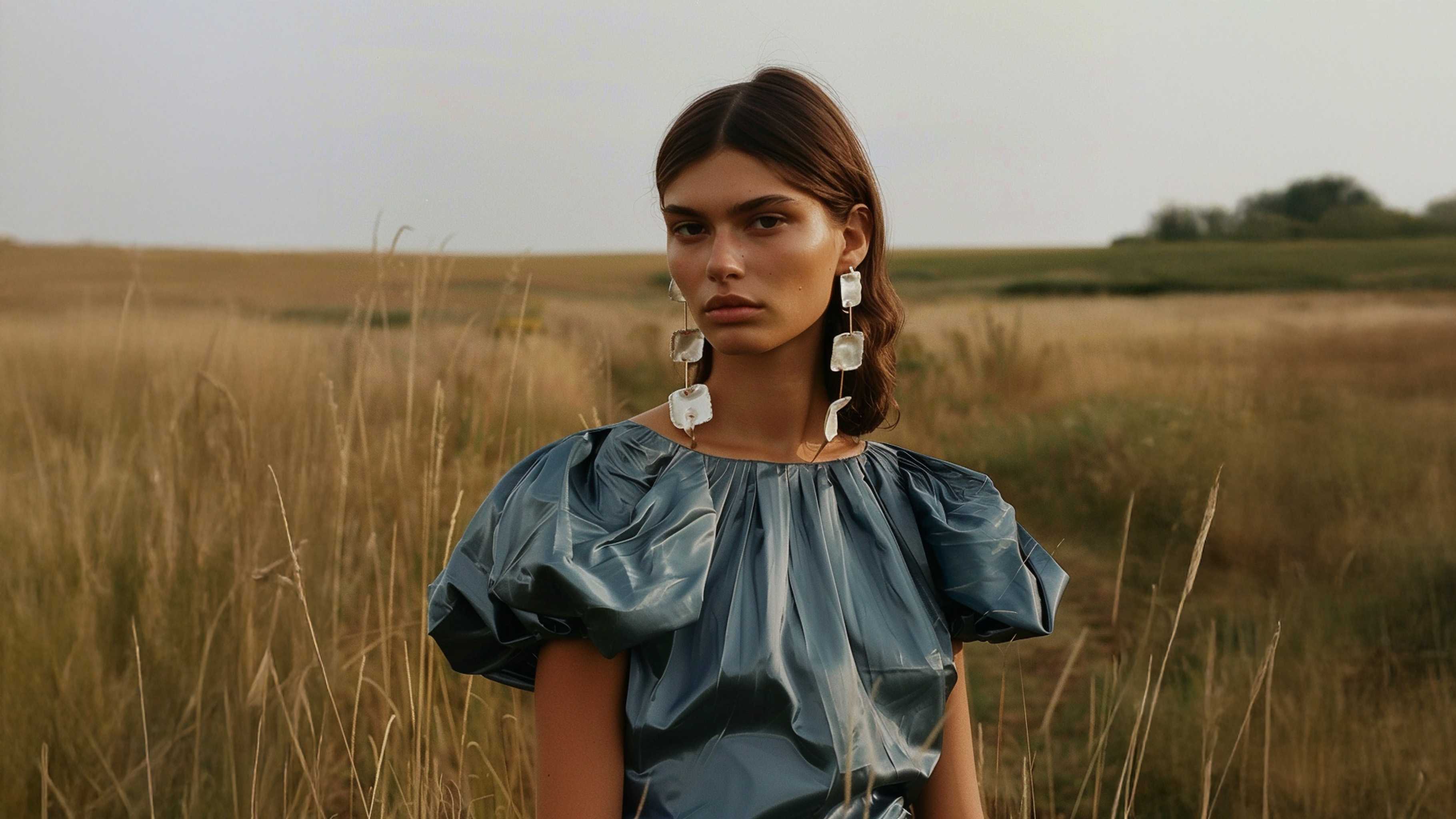 Cada prenda combina modernidad y lujo, utilizando colores vibrantes como dorado y verde turquesa.